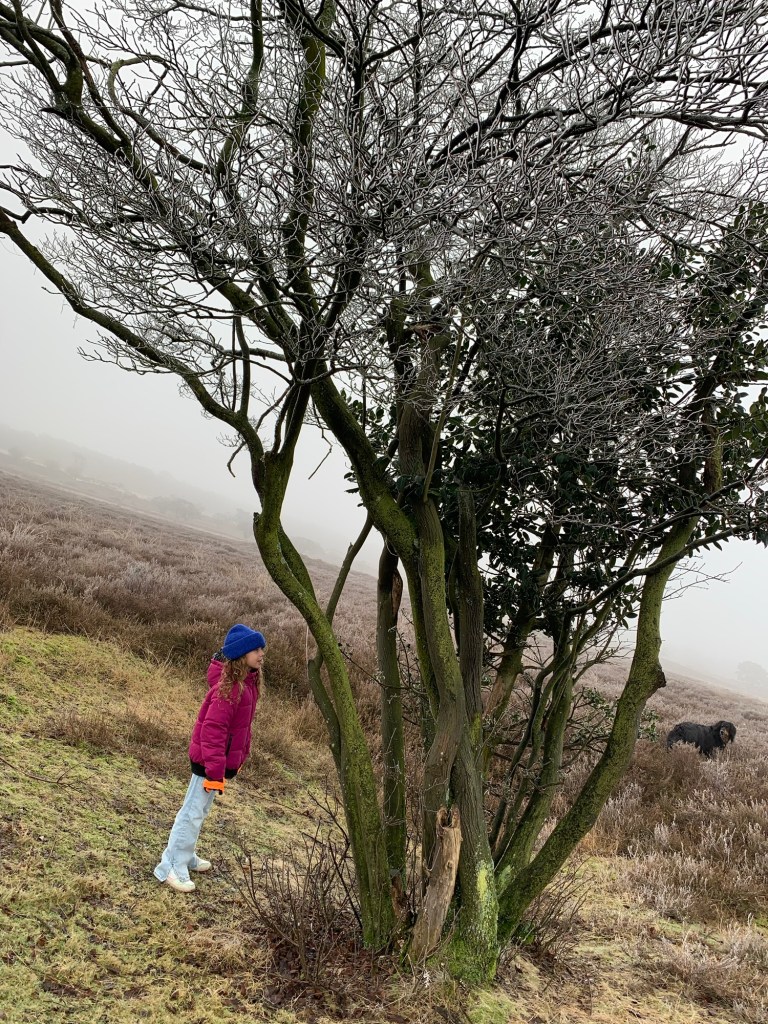 We belandden op een prachtige, door een waas van bevroren dauw bedekte heivlakte. Het schilderachtige landschap werd vrijwel direct bezoedeld door de hond, die omstandig haar behoefte deed langs het pad. Hierop volgde de gebruikelijke discussie wie dit op moest ruimen, die meestal langs de lijn ‘wie wilde de hond het graagst?’ verloopt. De oudste verloor, ruimde het zaakje op en we vervolgden onze weg.