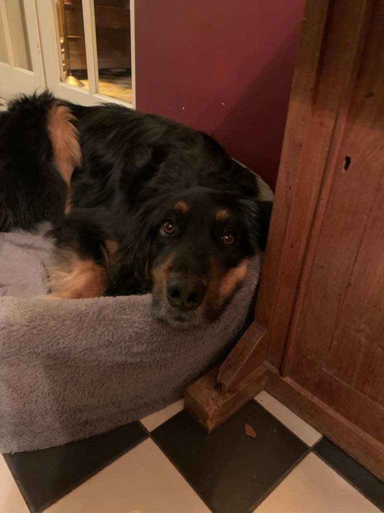 De hond, met het geheugen van een goudvis, positioneerde zich tactisch naast haar voederbak en probeerde mijn blik te vangen. Ik opende mijn mond, maar mijn oudste, die geen zin had in een herhaling van zetten, stond snel op. ‘Eén brokje, Djinn, en dan is het klaar.’