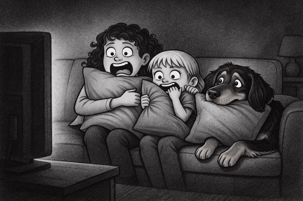 Vanaf zeven minuten in de serie verdween het kind steeds dieper achter de kussens van de bank en halverwege aflevering 1 moesten alle lampen hoog en de deuren op slot. Het eind van aflevering 2 haalden we – ondanks gemute geluid – niet. Toen het tijd was om de jongste te halen zat de oudste nog steeds trillend op de bank, in innige omhelzing met de hond. Moest ik nondeju zonder waakhond op de fiets het donker in.